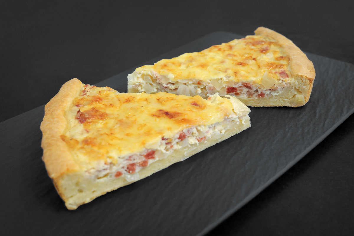 Dieser Zwiebelkuchen wird mit einem Spezialguss gebacken, einer Gruppe von Gussmassen, die zur Teigveredelung verwendet werden. Sie sind alle Mischungen aus Milchprodukten, Eiern und weiteren Zutaten. Beim Backen stocken sie leicht und bilden eine aromatische, verbindende Schicht. Sie werden in den unterschiedlichsten Backwaren verwendet, vom Käsekuchen über Obsttartelettes bis hin zu herzhaften Varianten wie diesem Zwiebelkuchen. Wer das Thema weiter vertiefen und die Vielfalt solcher Massen kennenlernen möchte wird an dieser Stelle fündig.
